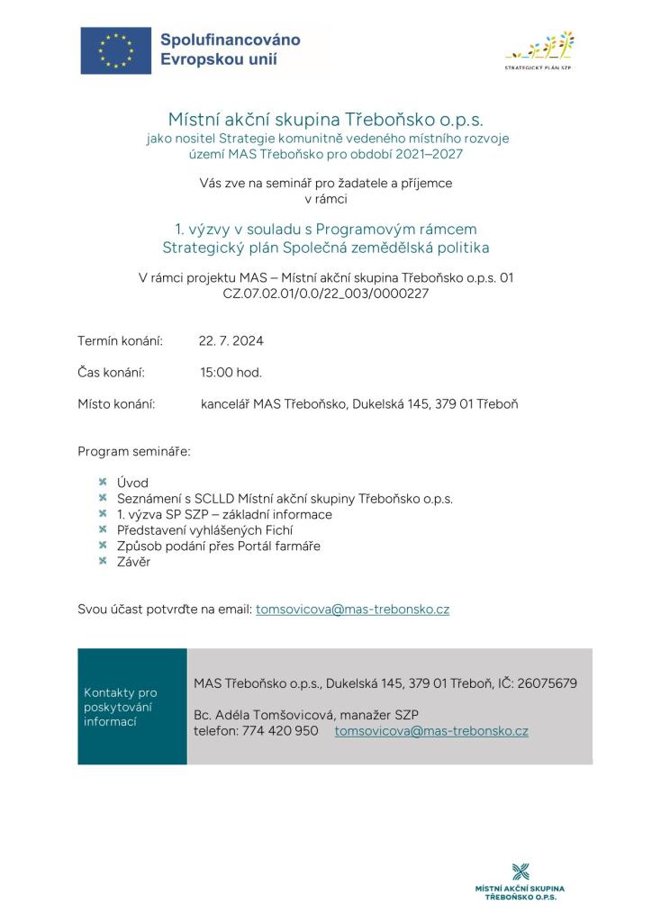Seminář se bude konat v kanceláři MAS Třeboňsko, Dukelská 145, 379 01 Třeboň a dozvíte se na něm základní informace k výzvě, podrobnosti vyhlášených Fichí i informace k podání přes Portál farmáře. Účast na semináři je zdarma. Účast prosím potvrďte na email: tomsovicova@mas-trebonsko.cz